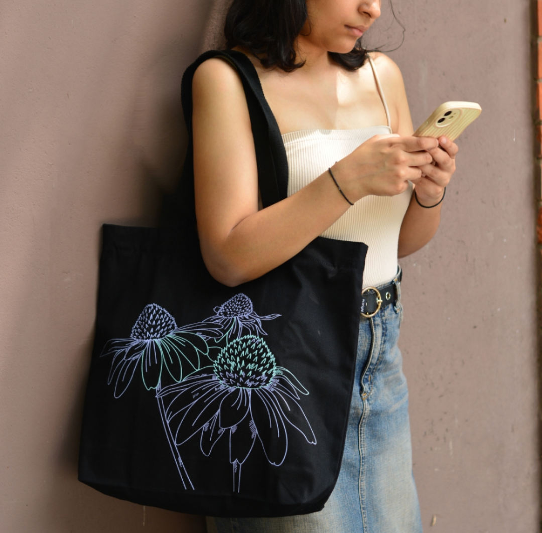 A chic black tote adorned with delicate floral line art---perfect for everyday elegance.