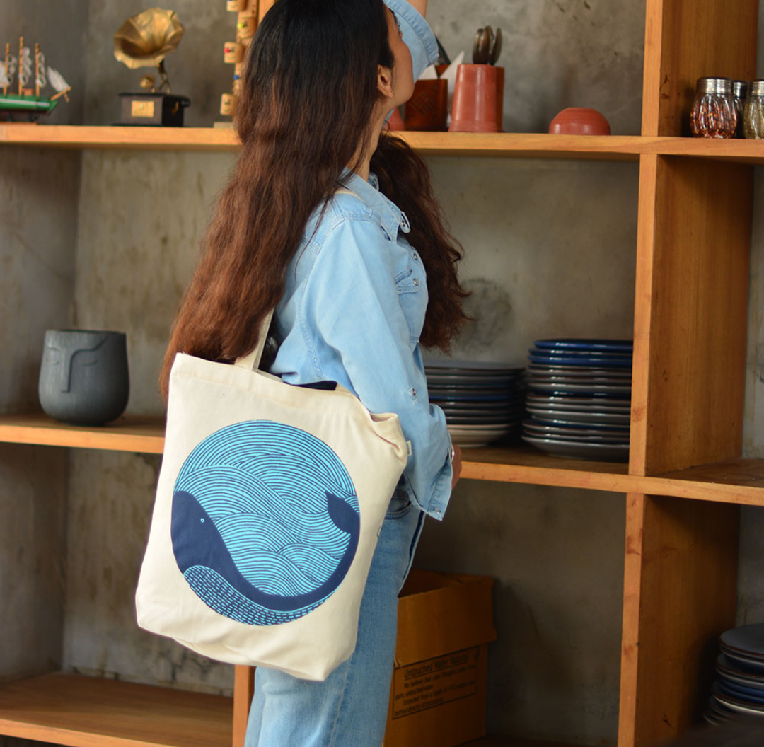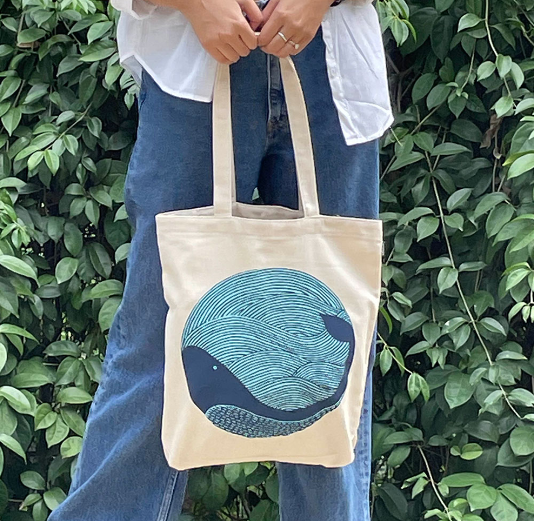 A natural cotton tote featuring an artistic whale swimming through stylized waves---for all your ocean-inspired adventures.